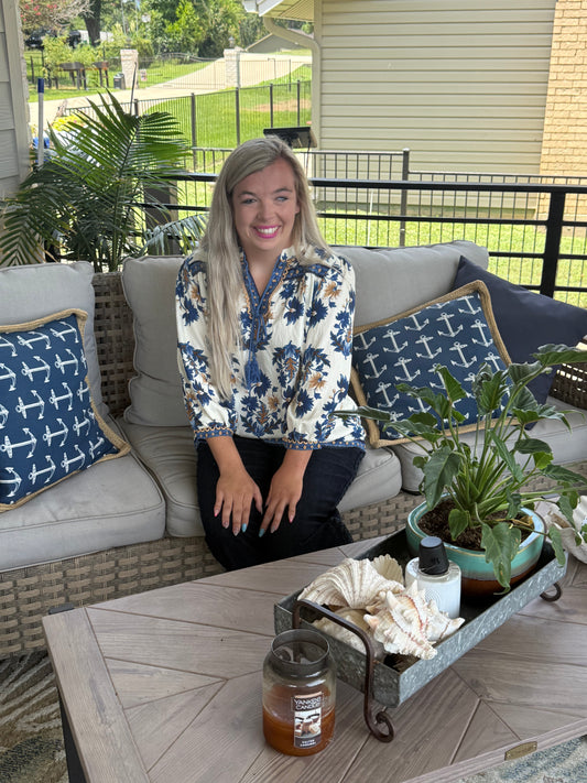 Royal Blue/Cream Tassel Blouse