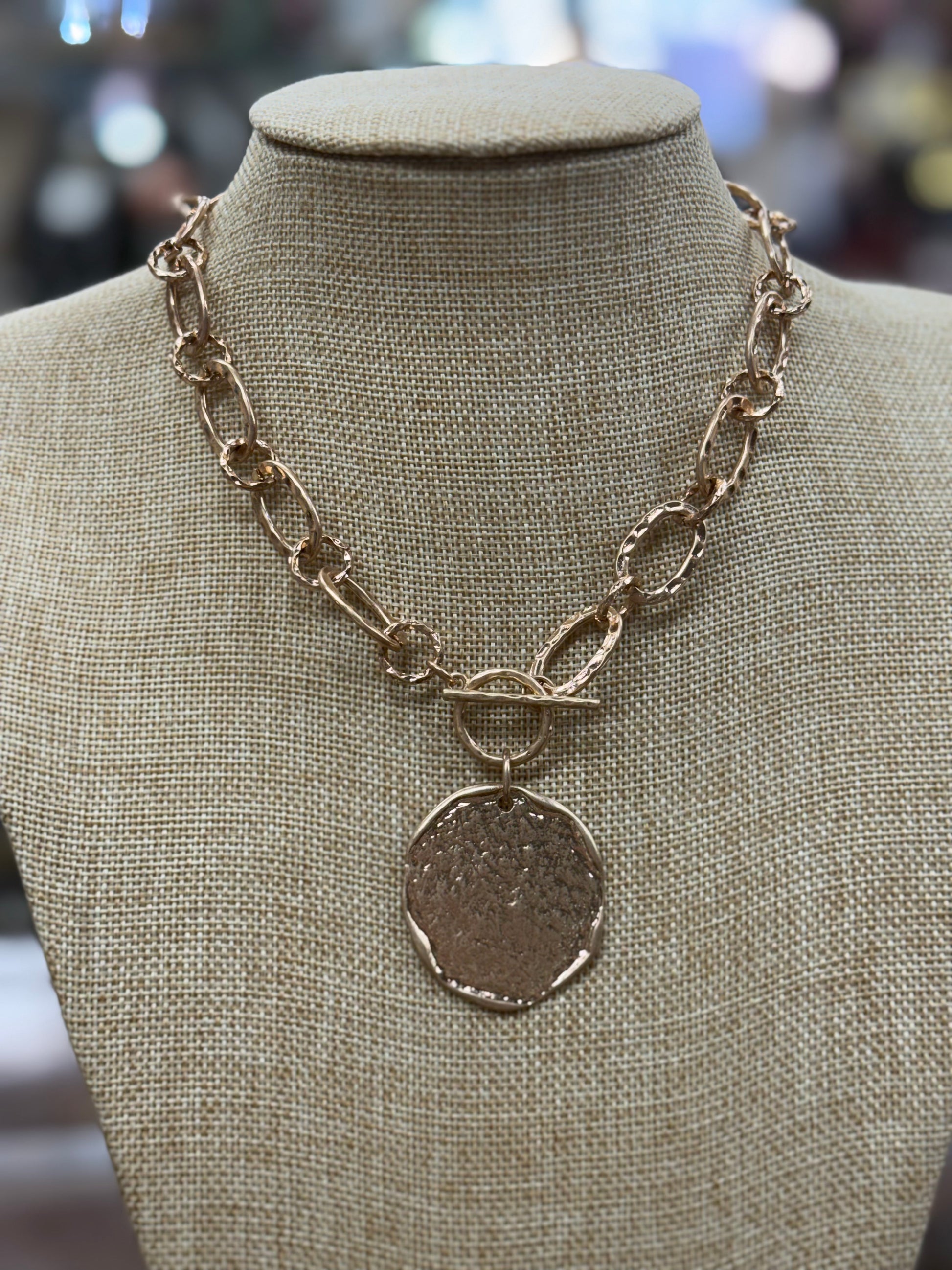 Elevate your everyday look with this charming gold chain featuring a beautifully hammered coin pendant. The delicate open-link design adds movement and dimension, while the textured coin charm catches the light with every wear. Perfect for layering or wearing solo, this versatile piece brings a touch of understated elegance and playful sophistication to any outfit.