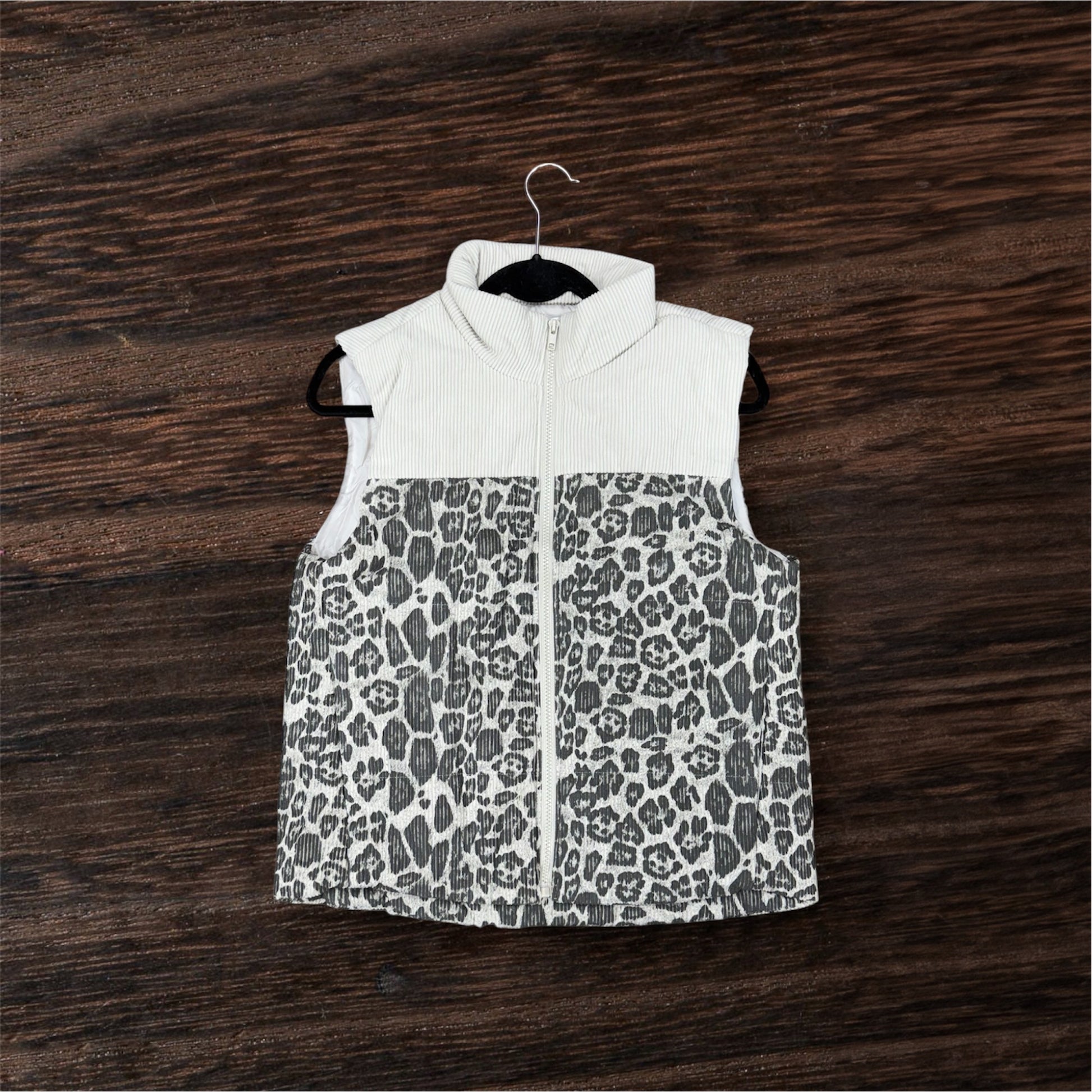 This cozy corduroy vest features a bold cheetah print and a puffy design for stylish warmth and comfort.