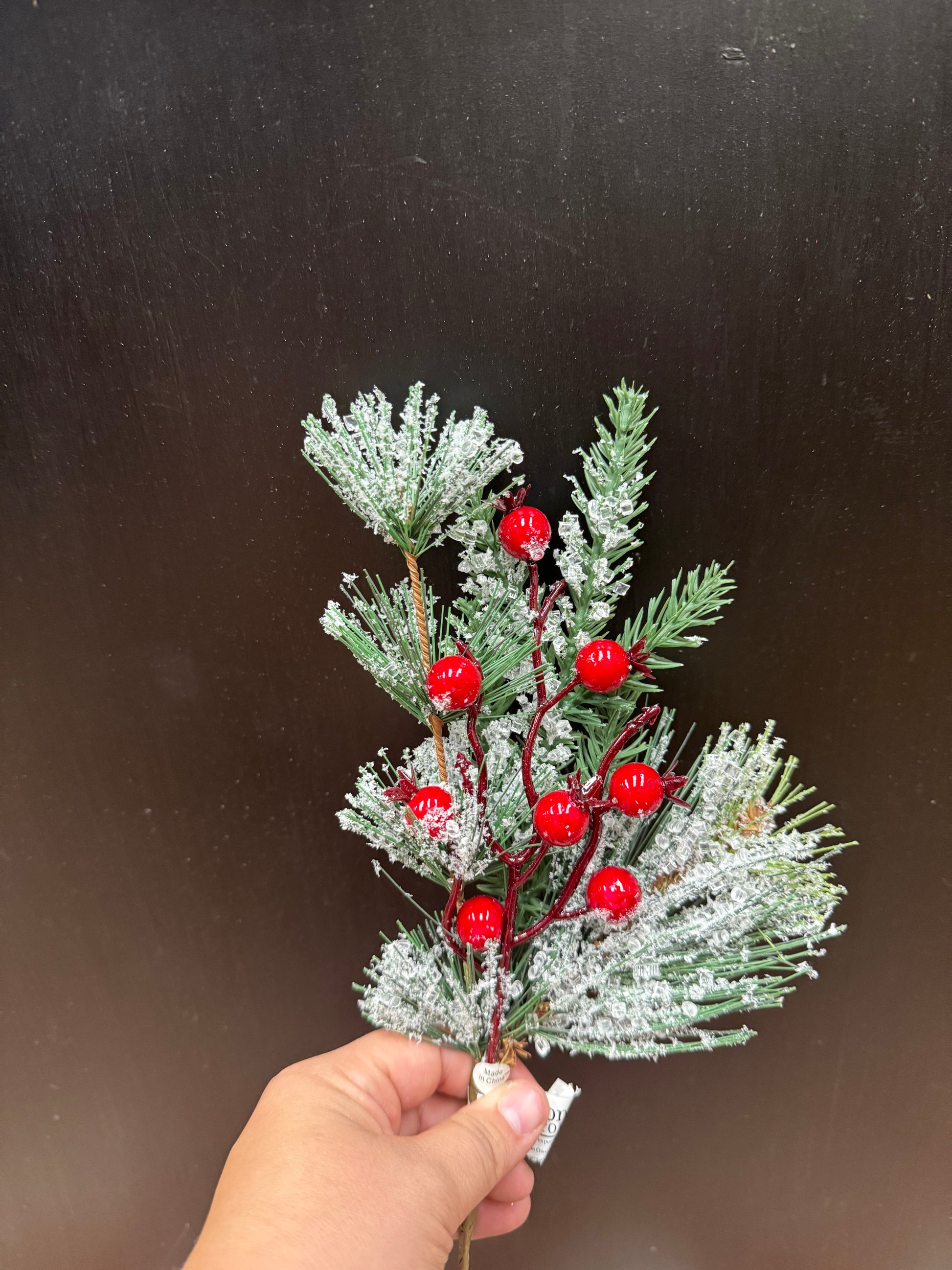Bring home the charm of winter with this Frosty Pine Spray adorned with vibrant berries, perfect for adding a festive touch to any space.